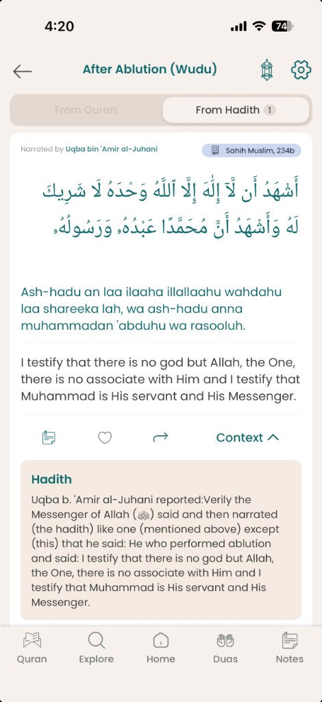 Every dua in the app is sourced from the Quran or authenticated hadith collections including Sahih Bukhari, Sahih Muslim, and other major books. Each entry shows its source reference so you can verify the authenticity yourself.