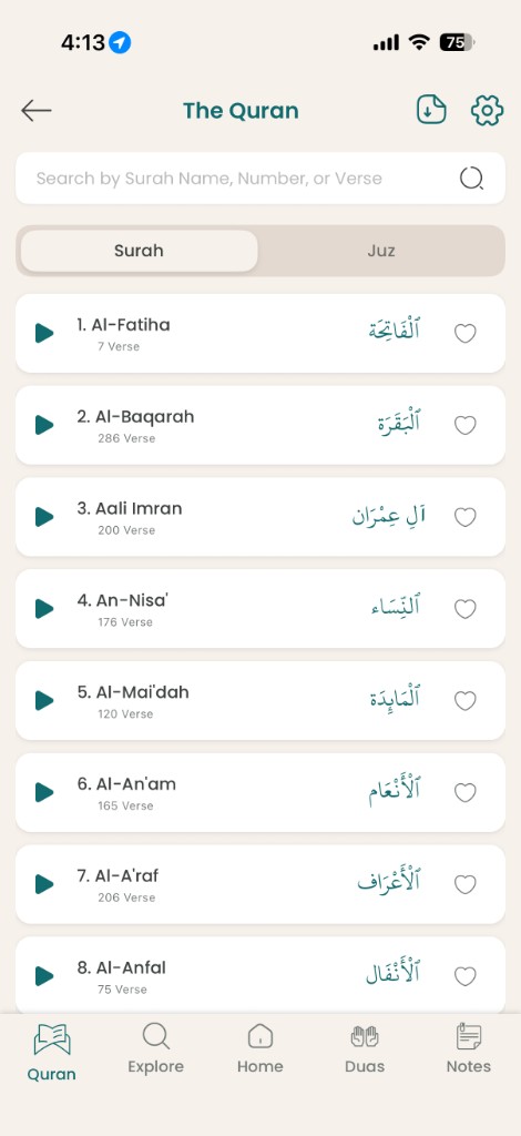 Deen automatically tracks your last-read position so you can resume instantly. You can also favorite individual verses and surahs to build a personal collection for quick access.